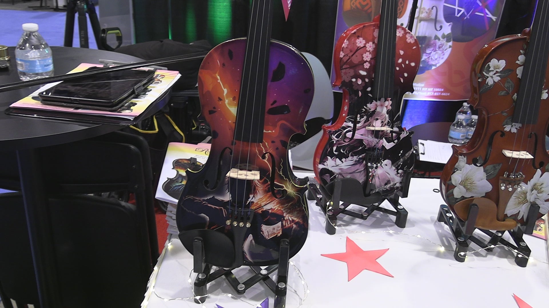 Lovely Cherry Blossom Girl, inspired by the fragrant beauty of Japan in Springtime, imaginations soar, with the bold red and pink floral theme, with the beautiful Anime Girl violinist! All hand-carved, all solid spruce and maple body with a sparkling gloss finish. It's ideal for creative multi-style string play!