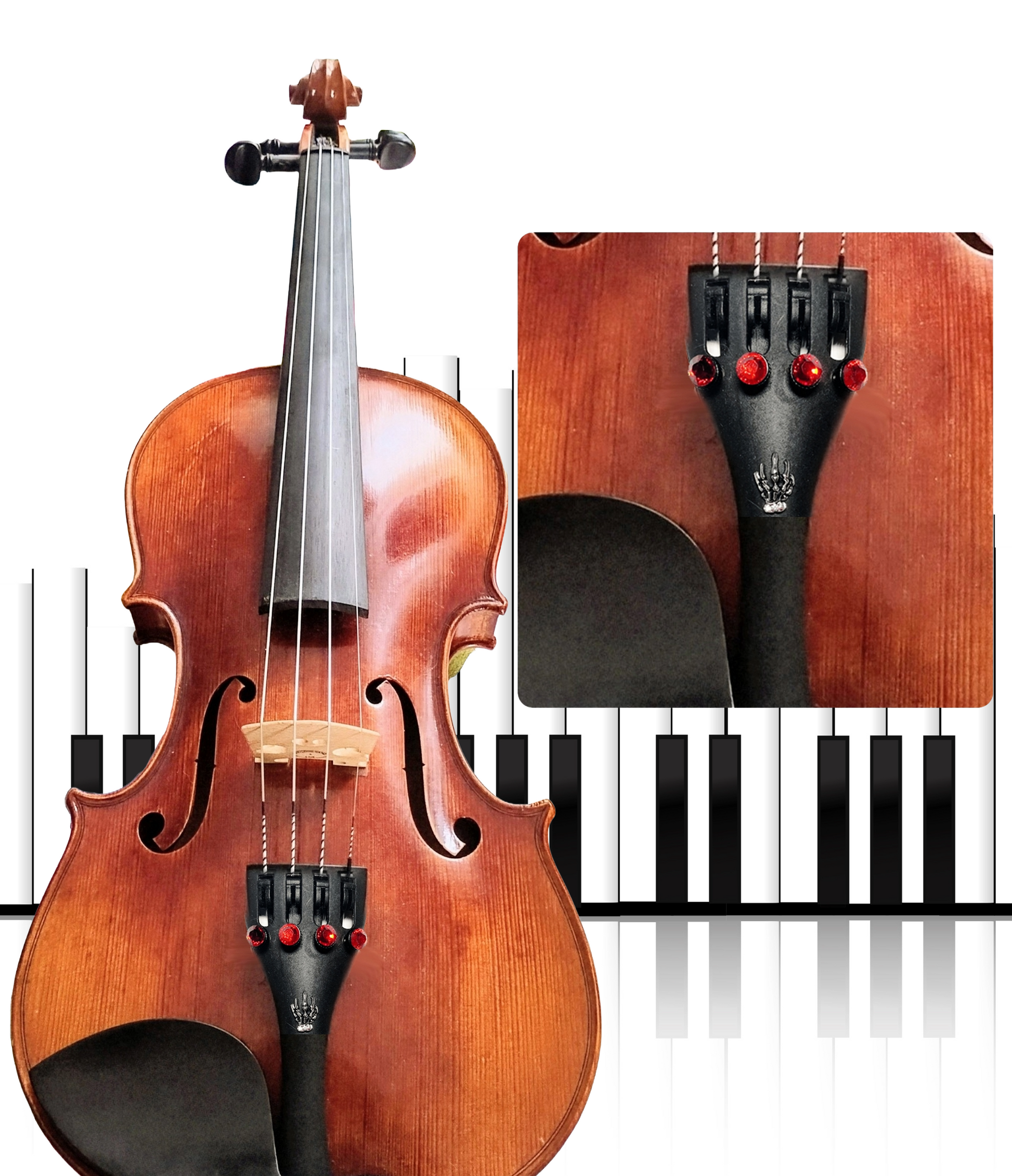 For musicians who embrace the dramatic and unconventional, our Skull Tailpiece brings gothic elegance to classical music with its striking skeleton hand design and choice of blood-red or deep purple crystal fine tuners. The intricately detailed skeleton hand motif adds theatrical flair that's perfect for alternative classical performances, Halloween concerts, or any musician who wants to challenge traditional expectations while maintaining exceptional quality. Available with either crimson red crystals for a bold, fiery look or rich purple crystals for a more mysterious, regal appearance, this tailpiece speaks to artists who aren't afraid to express their unique musical personality. Quality craftsmanship meets rebellious artistry in this conversation-starting piece.