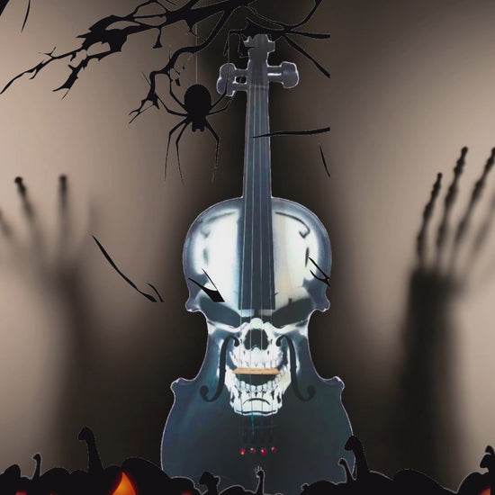 Experience the captivating sound and striking aesthetics of the Scourge of War Skull Violin w/ Matching Carbon Fiber Bow Case Crystal Fine Tuners Rosin Strings SetUp. This extraordinary instrument goes beyond mere functionality; it is a statement piece that embodies creativity and craftsmanship. Handcrafted with a unique skull design, every violin is truly one-of-a-kind, making it a perfect addition to any musician's collection.